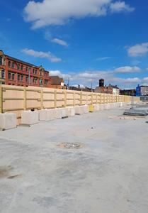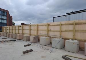 Our installs team secured the perimeter of the site using free standing timber hoarding, supported by concrete legato blocks.